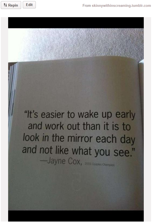 Of course, it sucks to wake up early and workout and still not like what you see in the mirror, which is very commonly what happens. So it might be easiest in the long run to work on not hating yourself when you look in the mirror in the first place.